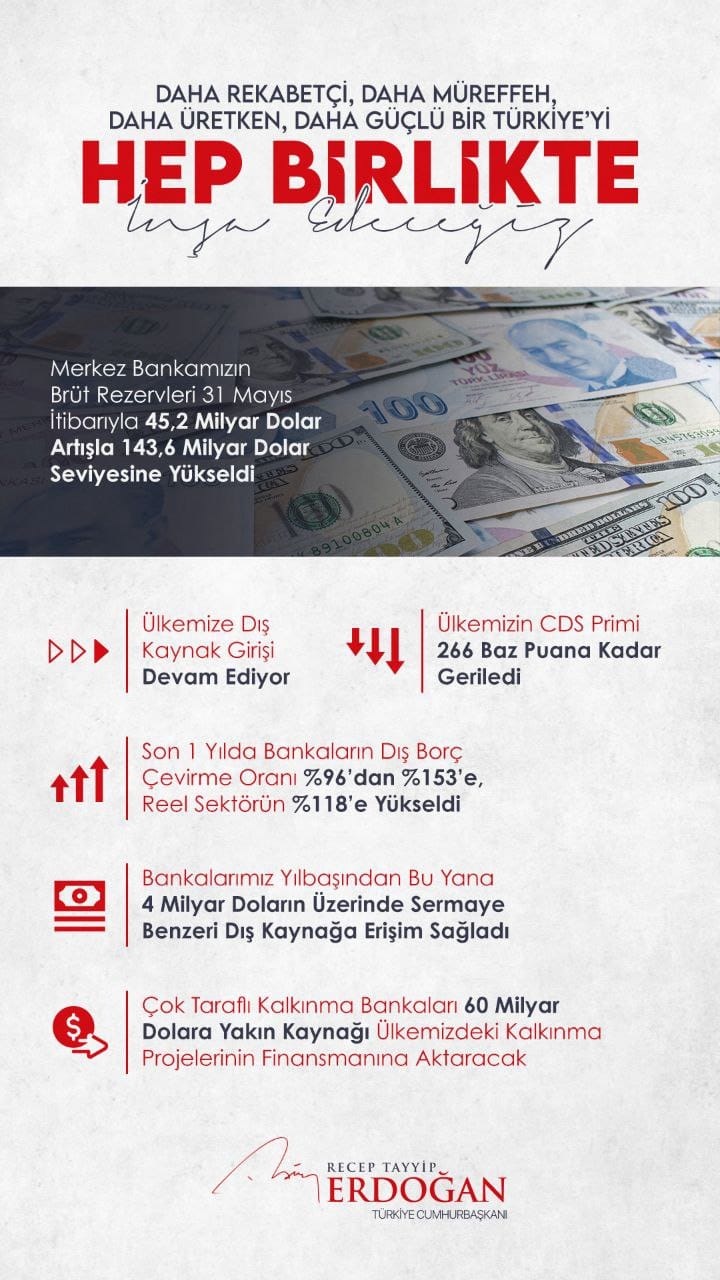 Finans GEMHABER 11 Haziran 2024 Merkez Bankamızın Brüt Rezervleri 31 Mayıs İtibariyle 45,2 Milyar Dolar Artışla 143,6 Milyar Dolar Seviyesine Yükseldi… Başkan Recep Tayyip Erdoğan… Bu haberi paylaşın: