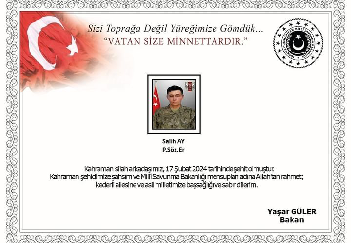 Pençe-Kilit operasyonu bölgesinde şehit düşen piyade sözleşmeli er Salih Ay'a Allah'tan rahmet diliyoruz. Yaralı askerimize…